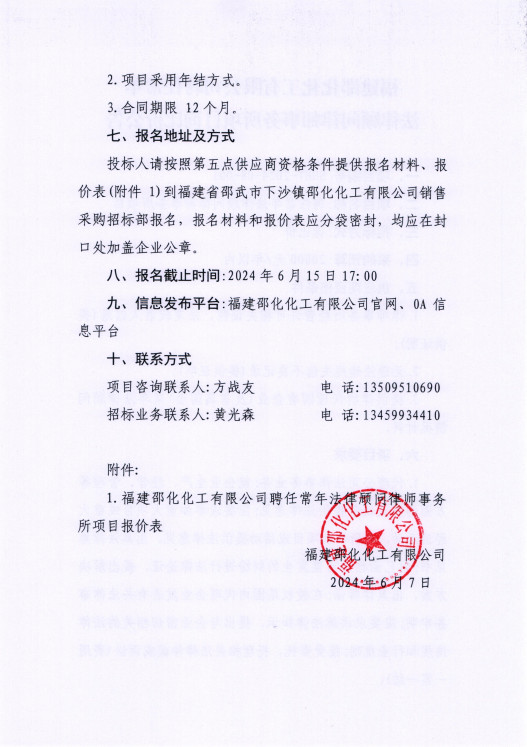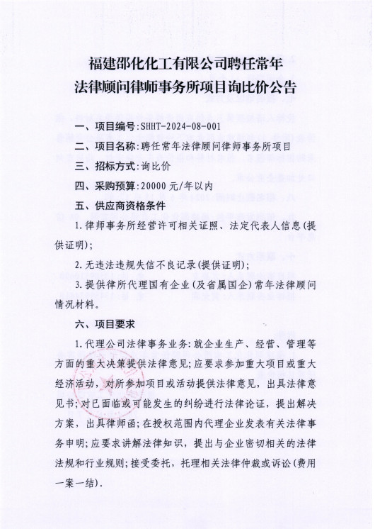 福建邵化化工无限公司聘用终年法令参谋状师事件所名目询比价告诉布告